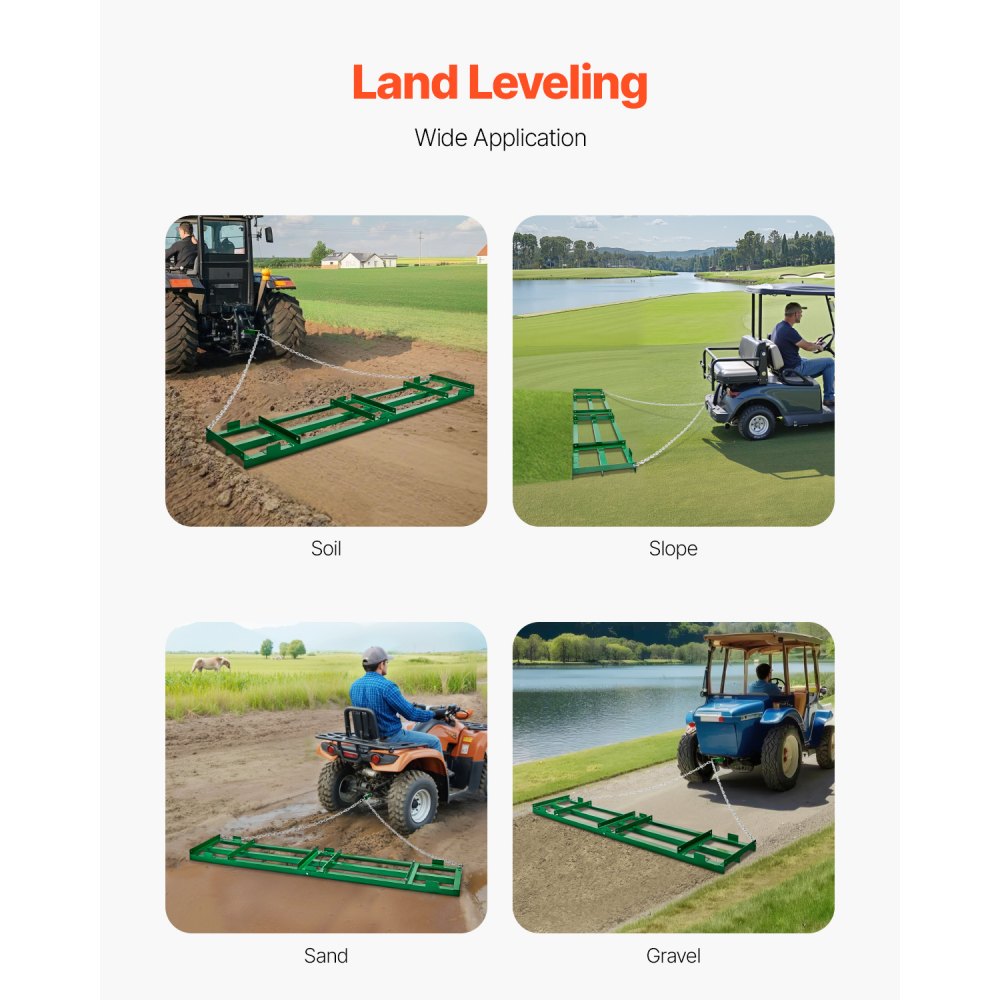 Aplicaciones versátiles: Este rastrillo de arrastre es ideal para nivelar tierra, césped, arena y grava. Es la herramienta ideal para nivelar campos, caminos de acceso, estacionamientos y más, lo que hace que las tareas de gestión de tierras sean eficientes y sin complicaciones