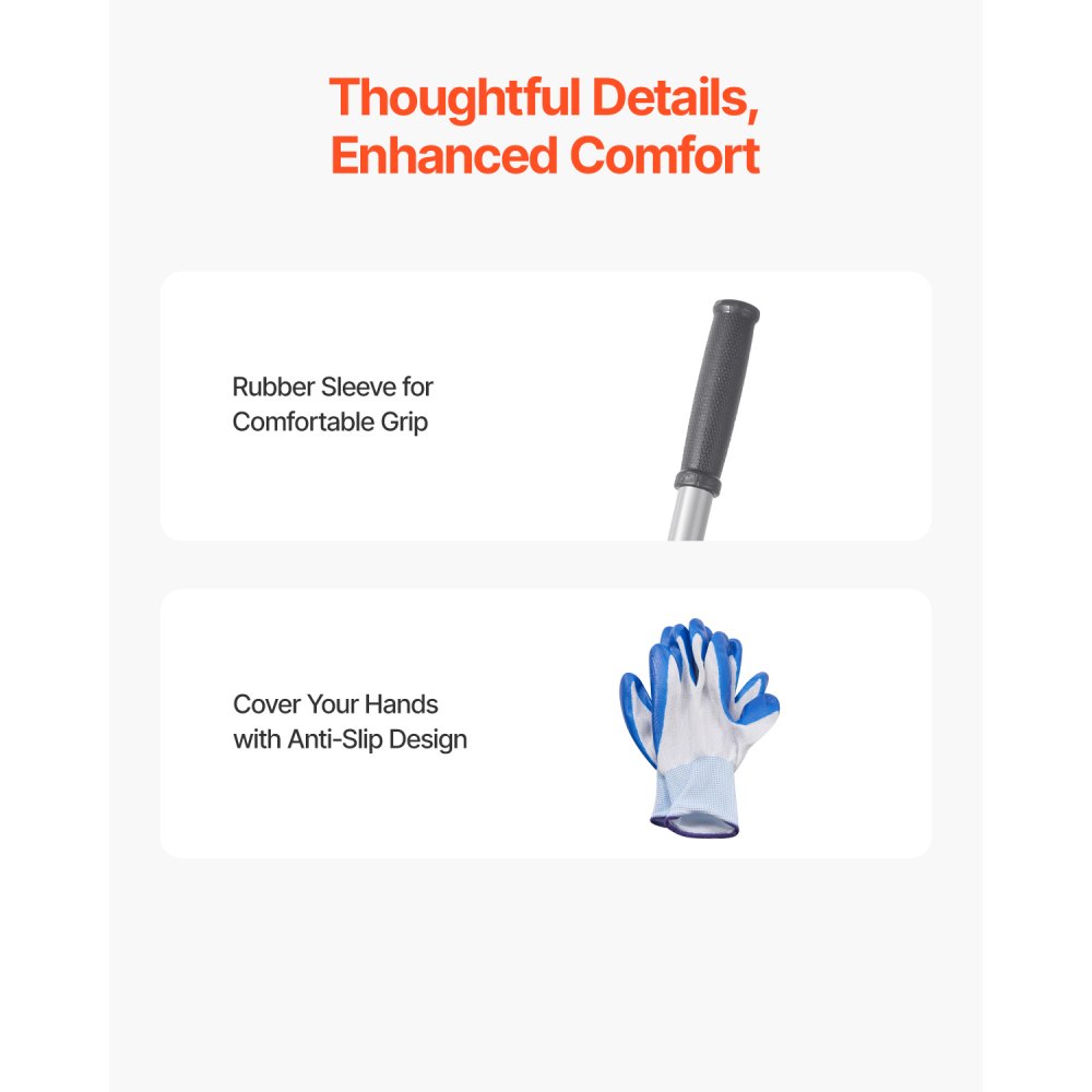Cómodo y fácil de usar: El mango ajustable de 4 secciones brinda comodidad para personas de diferentes alturas. La funda de goma antideslizante ofrece un agarre cómodo. El rastrillo nivelador de jardín puede girar 180°, lo que elimina la necesidad de levantar objetos con fuerza y volcar el piso. Cada detalle está diseñado para aliviar la fatiga durante el trabajo