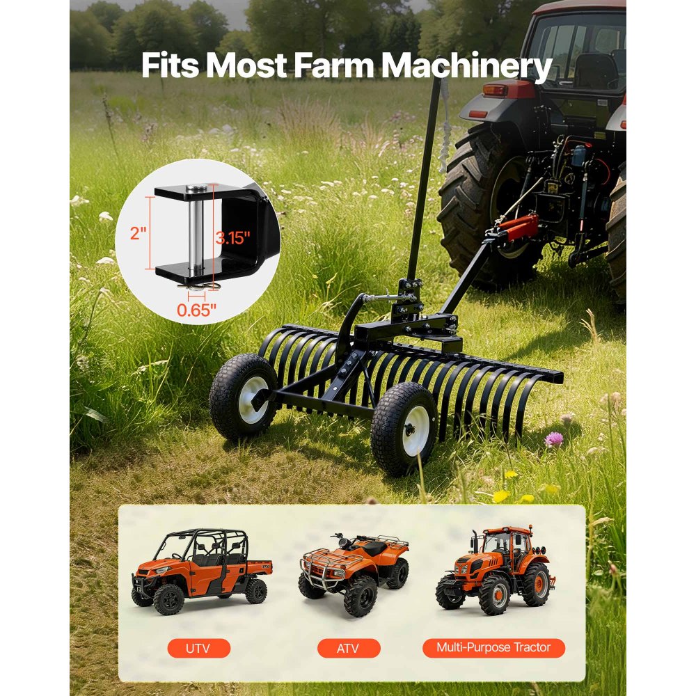 Compatibilidad amplia: Este rastrillo de jardinería de alta resistencia incluye un pasador de enganche universal (diámetro de apertura: 50 mm; diámetro del pasador: 16,5 x 80 mm) que se conecta fácilmente a sistemas de enganche tripuntal de categoría 1. Es compatible con ATVs, UTVs y tractores utilitarios