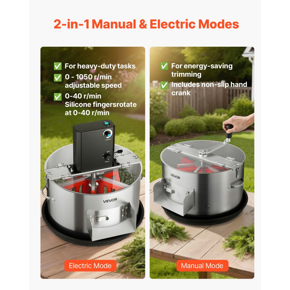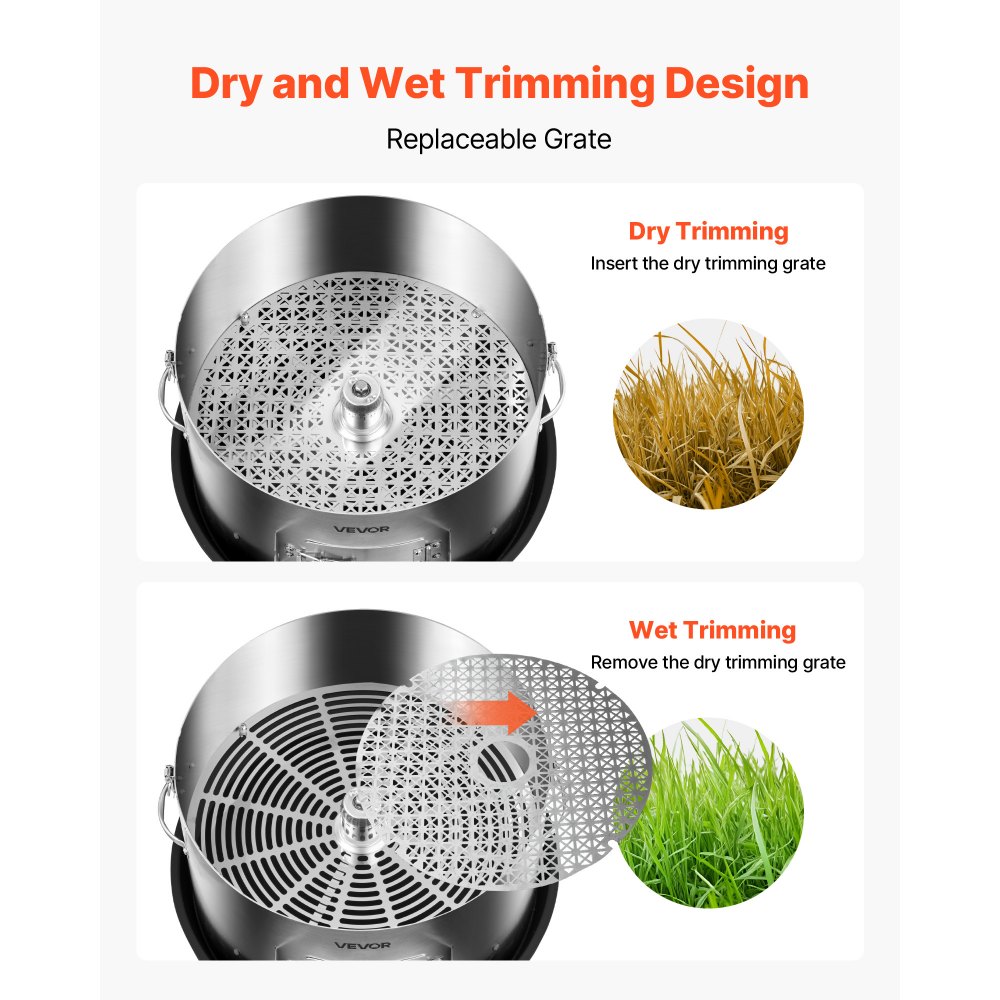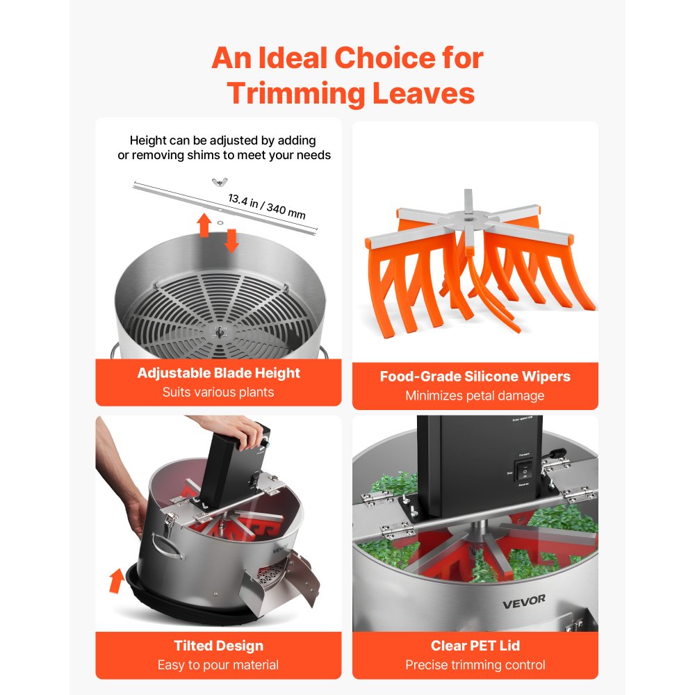 Tamaño más práctico: La altura de la cuchilla es ajustable para adaptarse a diferentes tipos de plantas. Una cubierta transparente proporciona buena visibilidad, mientras que los cepillos de silicona de grado alimenticio protegen suavemente los cogollos y reducen los residuos. El recipiente y el soporte de acero inoxidable facilitan la recolección de residuos, manteniendo el espacio de trabajo limpio