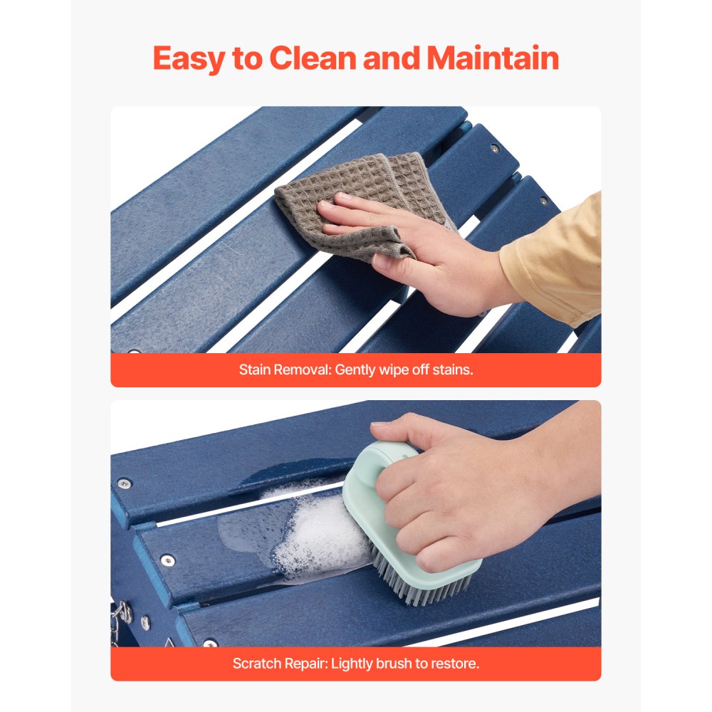 Fácil montaje: solo 4 pasos: Abre los pernos de la cadena, inserta los tornillos, aprieta y asegura el taburete Adirondack. Se monta rápidamente, lo que te ahorra tiempo y esfuerzo. Limpia con agua y jabón, y utiliza un cepillo suave o una esponja de lija para pulir los rayones