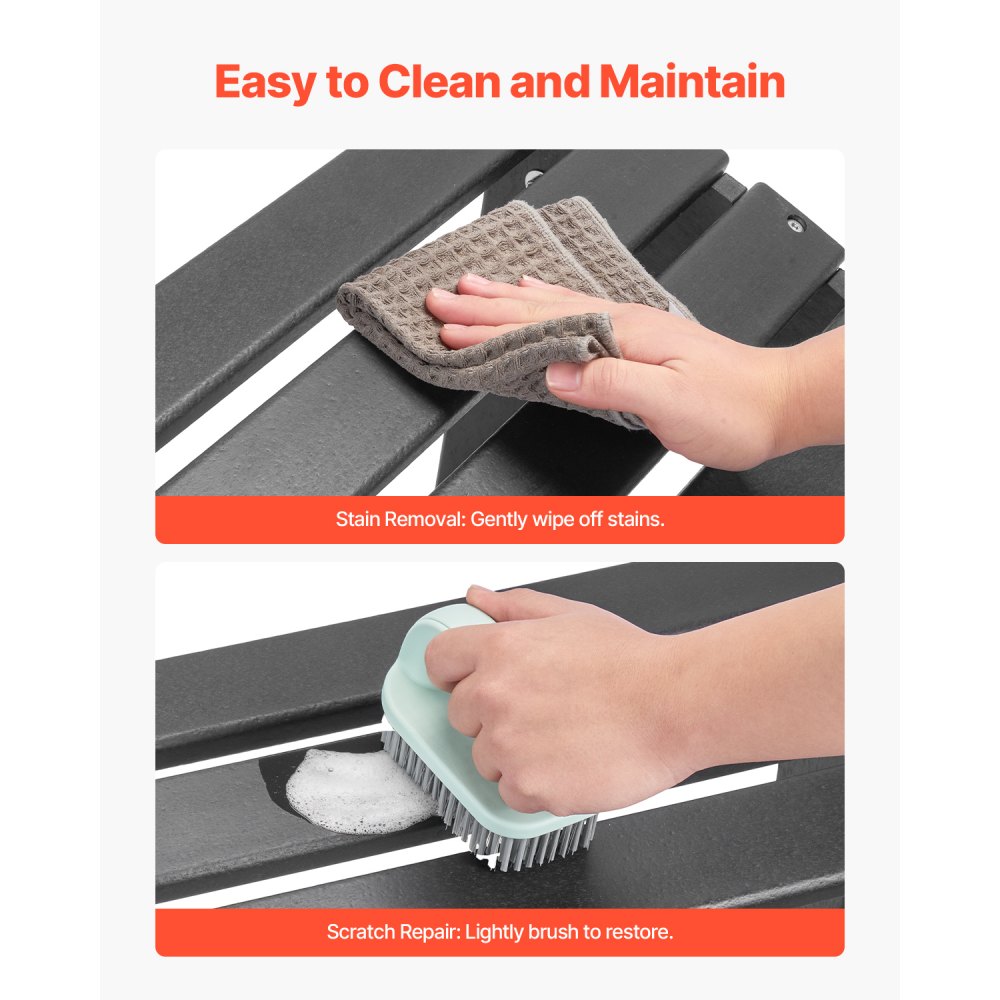 Fácil montaje: solo 4 pasos: Abre los pernos de la cadena, inserta los tornillos, aprieta y asegura el taburete Adirondack. Se monta rápidamente, lo que te ahorra tiempo y esfuerzo. Limpia con agua y jabón, y utiliza un cepillo suave o una esponja de lija para pulir los rayones