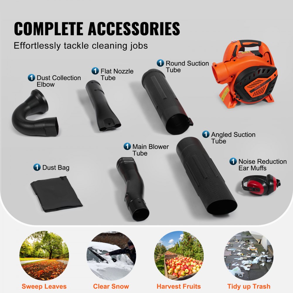 Kit completo de accesorios: el soplador de hojas a gas VEVOR viene con orejeras con cancelación de ruido, manual, tubo de aire principal, tubo de salida plano, tubo acodado para recolección de polvo, tubo de aire de succión redondo, un tubo de succión acodado, 3 llaves hexagonales, un destornillador, un casquillo, abierto llave, dos tipos de tornillos y tuercas, una bolsa recolectora, una bolsa de herramientas y una pequeña botella mezcladora, reduciendo el ruido.