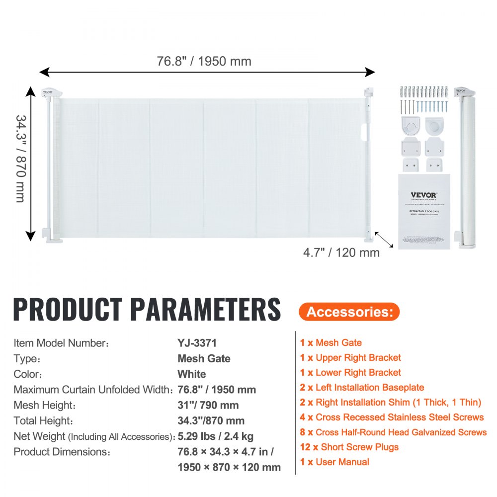 Diseño retráctil: Esta puerta de malla puede extenderse hasta 76,8 pulgadas (1950±10 mm) de ancho y la malla mide 31 pulgadas (790±8 mm) de alto, lo que le permite ajustar el tamaño de la abertura según sea necesario. El diseño retráctil facilita su almacenamiento cuando no está en uso, ocupando un espacio mínimo y manteniendo su hogar ordenado y espacioso.