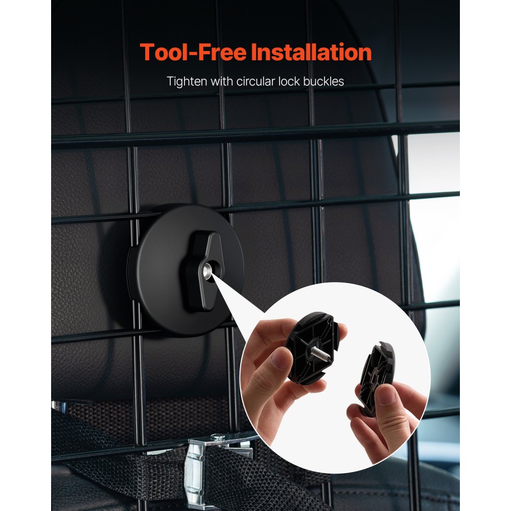 Instalación sin herramientas: Nuestra barrera para perros para el coche viene con cerraduras circulares, correas de nailon y cordones elásticos para una fijación segura a los reposacabezas. No requiere herramientas para su instalación, lo que garantiza una instalación sencilla y una sujeción firme y antideslizante
