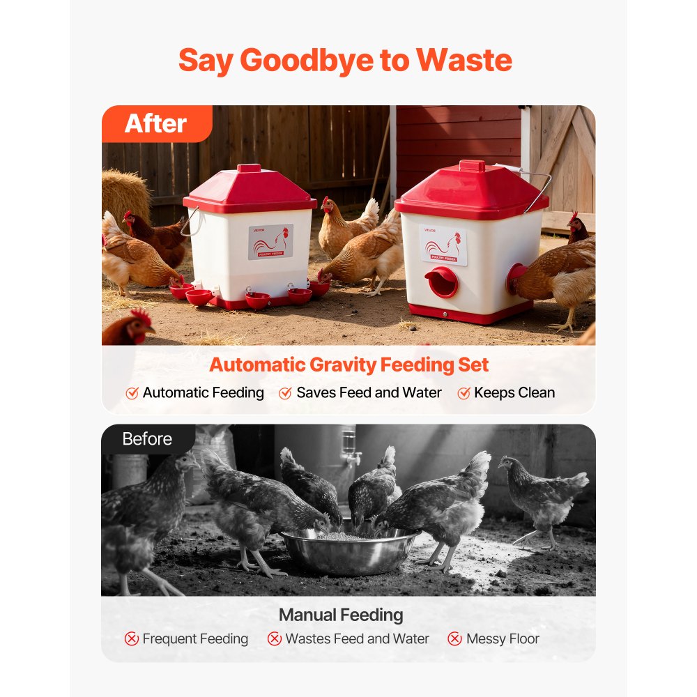 Gallinero más limpio, menos desperdicio: Se acabó el pienso derramado y el agua desperdiciada. Este comedero automático mantiene el gallinero ordenado, reduce el desperdicio de pienso y agua, y ahorra dinero. Su parte superior puntiaguda e impermeable evita la acumulación de agua de lluvia, manteniendo el comedero y el bebedero secos y limpios
