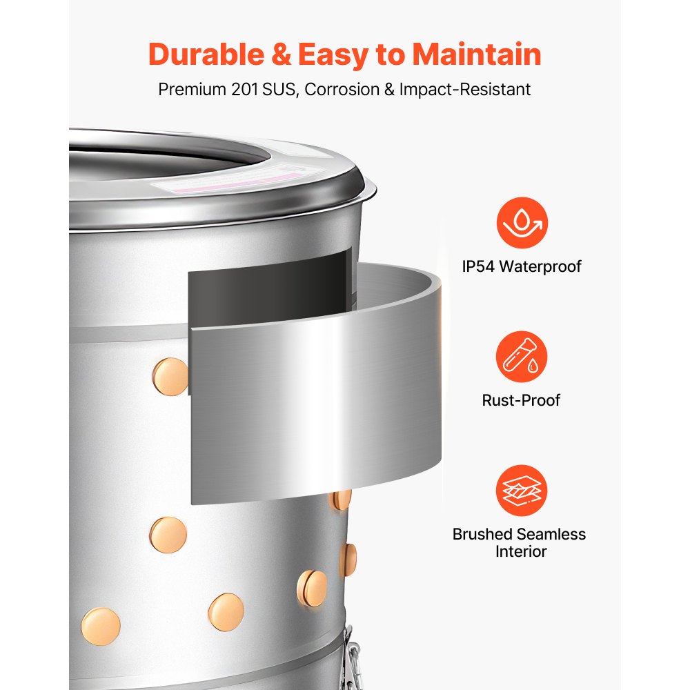 Construcción de alta calidad: La carcasa impermeable (clase de protección IP54) garantiza la máxima seguridad. El acero inoxidable 430 de grado alimenticio y el exterior resistente a la corrosión garantizan su durabilidad. Las patas y ruedas reforzadas aseguran la estabilidad a largo plazo de nuestra desplumadora eléctrica de aves