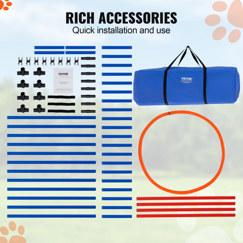 Contenido: Manual de instrucciones x1; conectores x8 de cuatro vías; conectores rectos x8; Tiras de velcro x3; publicar clips x8; 1 bolsa de almacenamiento para postes; anillo de salto x1; postes de base x8; puestos de acción x4; estacas de tierra x16; postes de soporte inferiores x4. Todo lo que necesitas para una configuración completa de entrenamiento de agilidad que esté lista para comenzar y divertirte de inmediato.