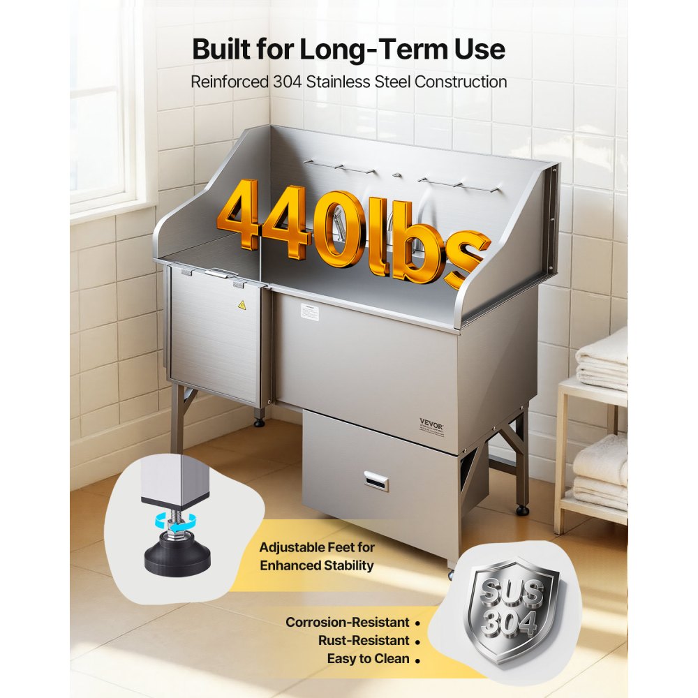 Diseño integrado: La bañera para perros cuenta con grifos de agua fría y caliente, ducha de doble control y dispensador de jabón. Este diseño facilita y agiliza el baño de las mascotas. El filtro de agua de polietileno proporciona una superficie de drenaje antideslizante, mientras que el gabinete de almacenamiento de 11 kg permite guardar de forma segura las estaciones de baño, manteniendo todo ordenado y organizado, facilitando así el baño de las mascotas