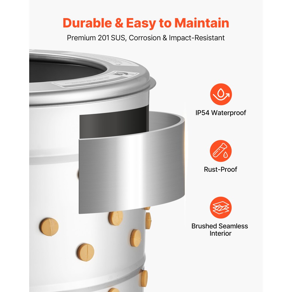 Motor potente y desplumado eficiente: Equipada con un motor de 900 W (230 V/50 Hz) que genera 230 rpm, esta desplumadora de pollos despluma 2 pollos (de 2,2 a 2,7 kg cada uno) en tan solo 30 segundos. La protección contra sobrecargas garantiza un funcionamiento continuo sin quemaduras