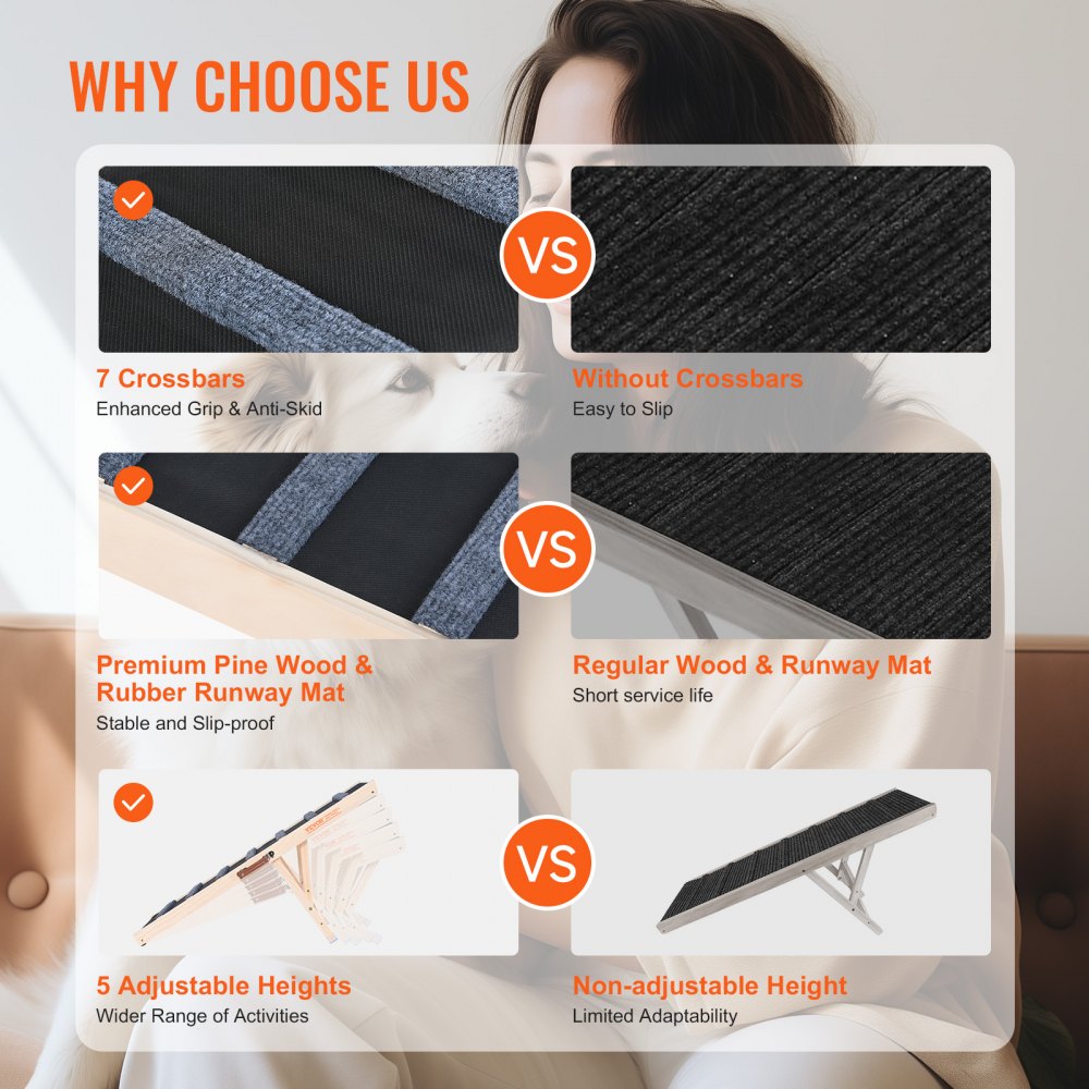 Resistente y duradera: hecha de madera de pino de primera calidad, esta rampa para perros ajustable de madera maciza es excepcionalmente estable y puede soportar mascotas que pesan hasta 100 lbs/45 kg. La adición de almohadillas de goma suave en la parte inferior brinda estabilidad cuando su mascota sube.