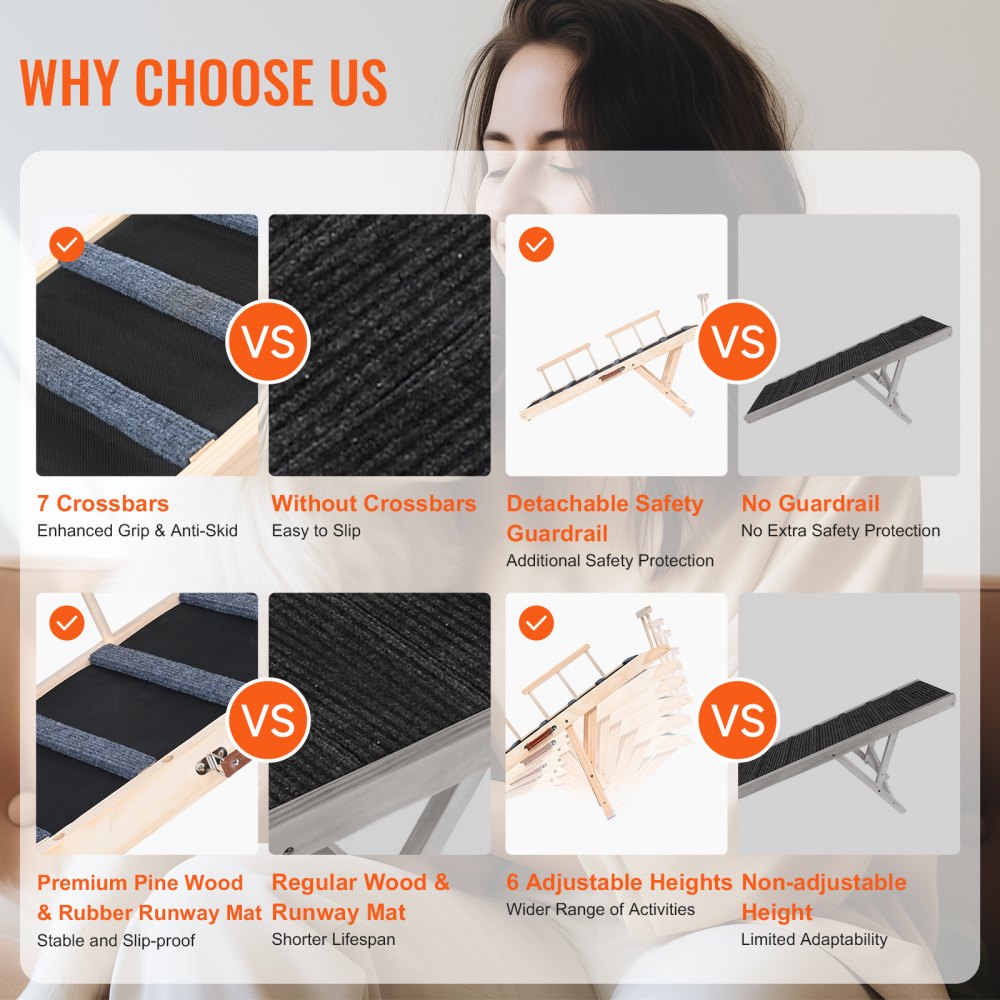 Resistente y duradera: hecha de madera de pino de primera calidad, esta rampa para perros ajustable de madera maciza es excepcionalmente estable y puede soportar mascotas que pesan hasta 250 lbs/113 kg. La adición de almohadillas de goma suave en la parte inferior brinda estabilidad cuando su mascota sube.