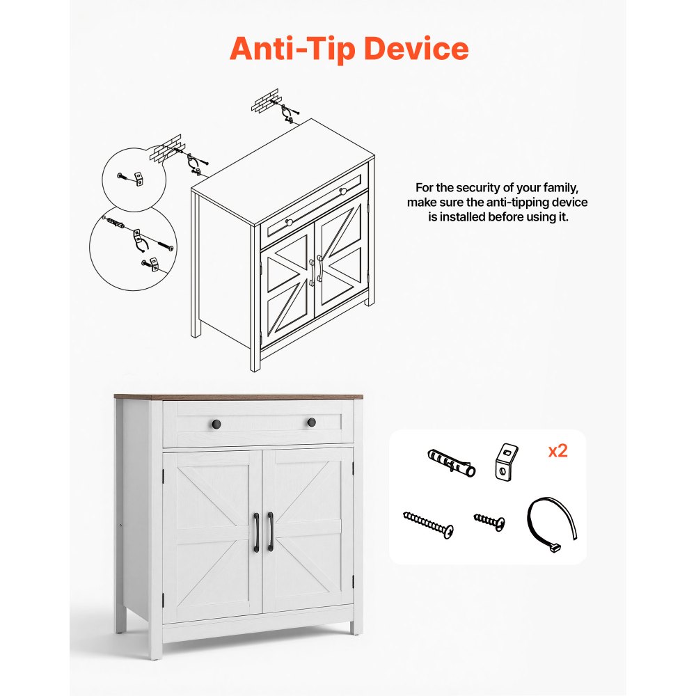 Construcción robusta: Nuestro aparador está fabricado con tablero de partículas grueso con una superficie duradera. La superficie soporta hasta 15 kg, cada estante hasta 10 kg y el cajón hasta 5 kg. Un sistema antivuelco integrado garantiza su estabilidad