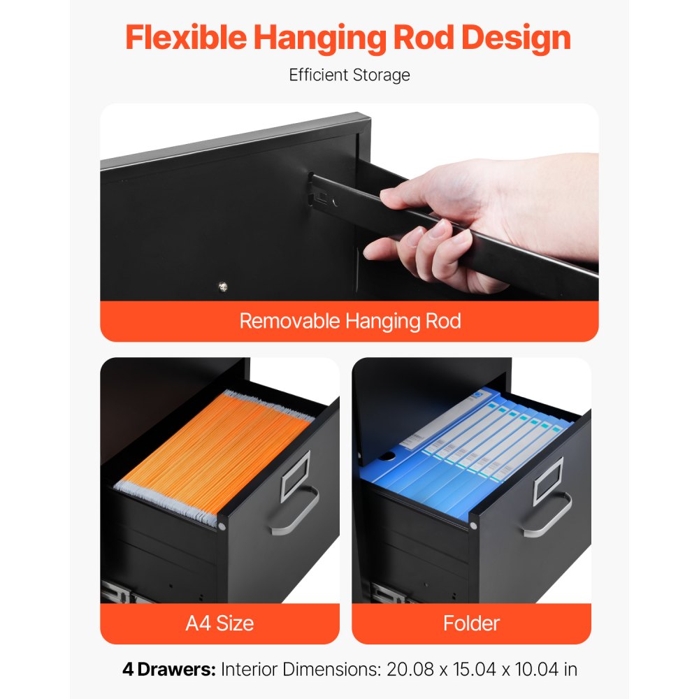 Archivador Vertical de Metal, Archivador Vertical 450 x 620 x 1340 mm de 4 Cajones con Cerradura, Barra de Suspensión Desmontable para Archivos de Tamaño A4/Carta/Legal para Oficina, Negro