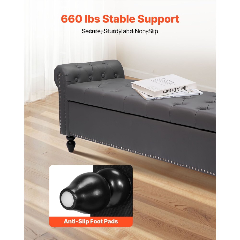 Soporte de peso reforzado: Fabricado con robustas patas de madera de caucho y una estructura de madera maciza, este banco de almacenamiento de cuero ofrece un soporte resistente y duradero. Diseñado para uso diario sin tambalearse ni hundirse. Dimensiones del banco: 460 x 1660 x 560 mm