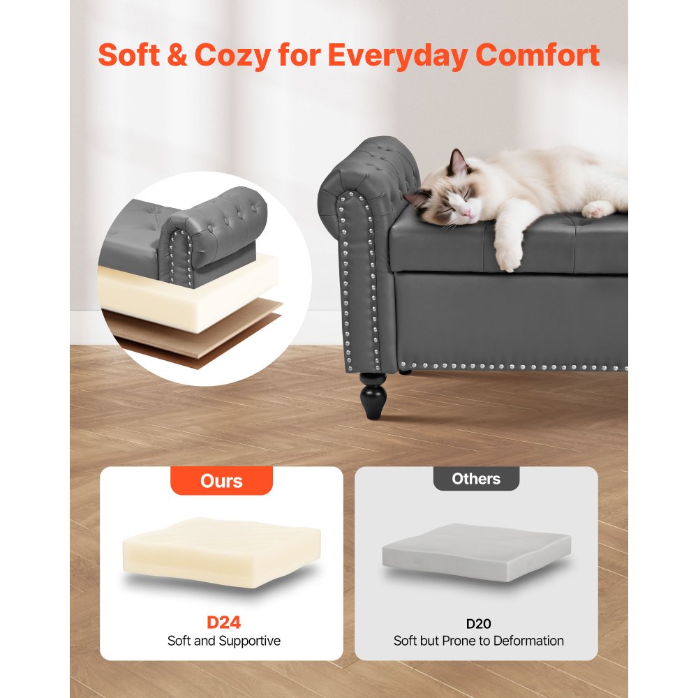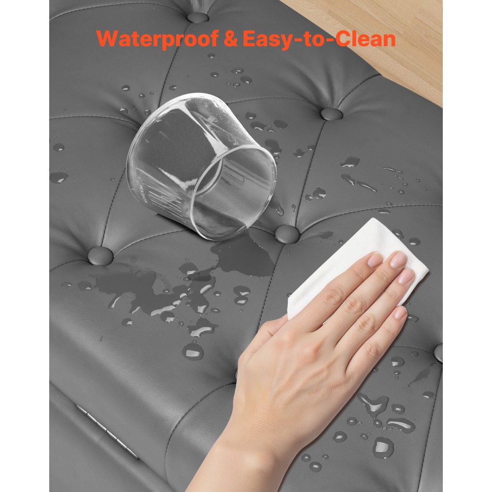 Cuero sintético suave: Revestido en cuero sintético de primera calidad con una textura sedosa y costuras refinadas. Resistente al agua y fácil de limpiar, ideal para hogares con mucho movimiento. Nuestro banco de cama con almacenaje añade un toque moderno y refinado a la decoración de tu dormitorio