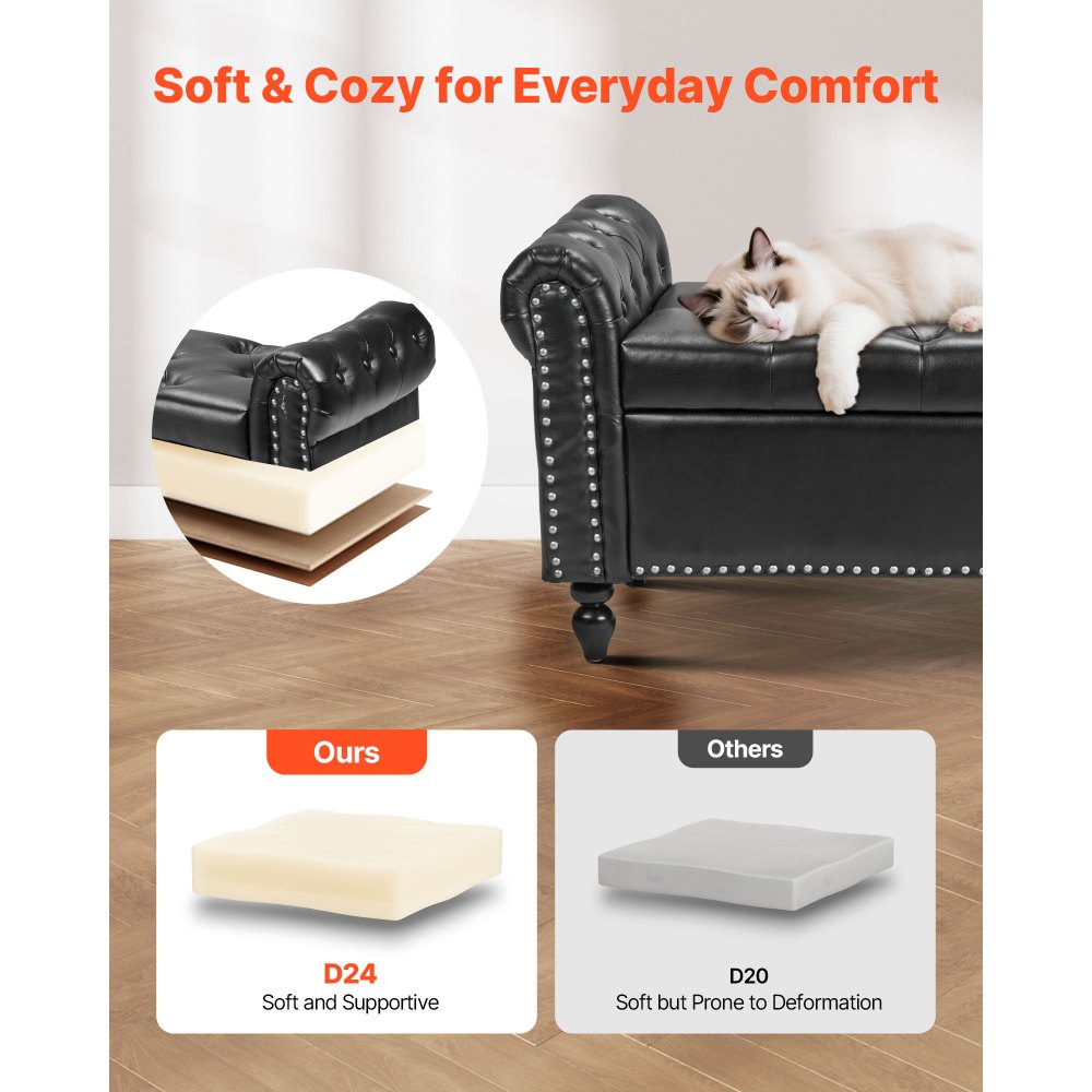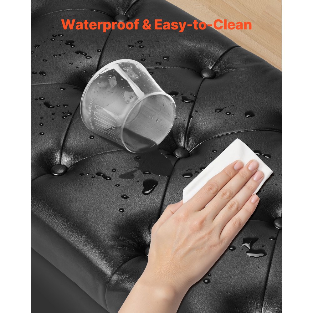 Cuero sintético suave: Revestido en cuero sintético de primera calidad con una textura sedosa y costuras refinadas. Resistente al agua y fácil de limpiar, ideal para hogares con mucho movimiento. Nuestro banco de cama con almacenaje añade un toque moderno y refinado a la decoración de tu dormitorio