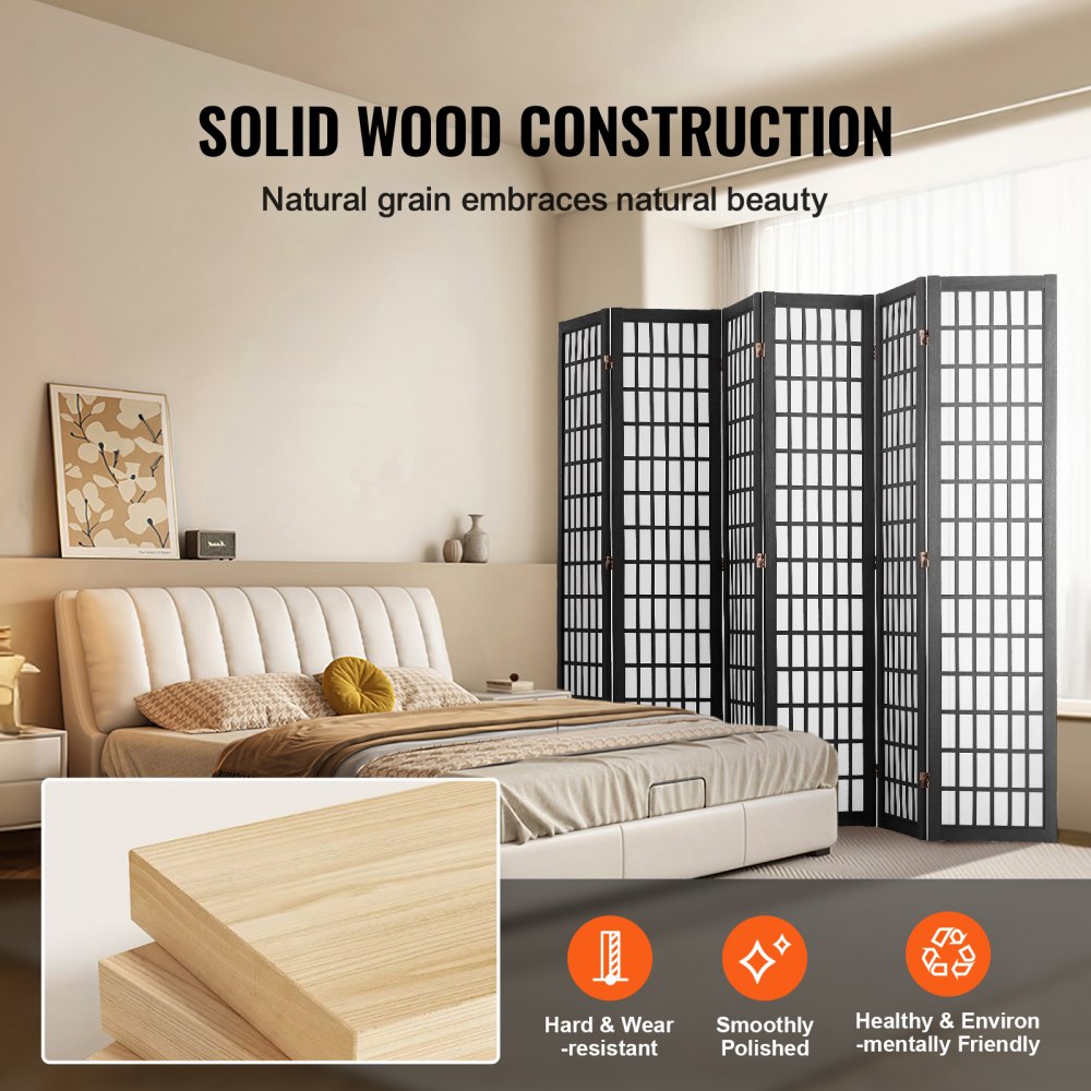 Biombo de 6 Paneles, Biombo Japonés Plegable 2420 x 1700 x 18,5 mm para Interiores, Separador Portátil y Decorativo para Separar Espacios en Casa, Oficina, Restaurante y Dormitorio, Negro - Material de oficina
