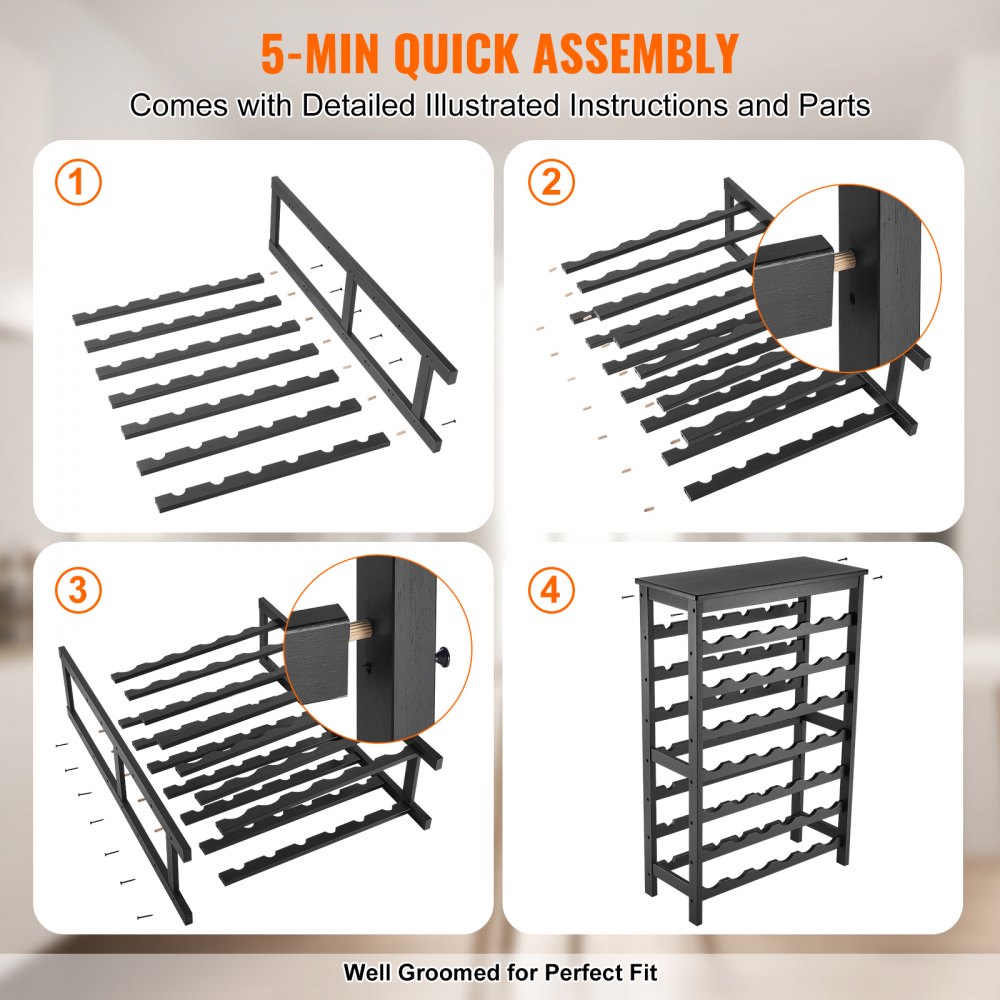 Fácil de montar: Montar nuestro botellero independiente es muy sencillo. Simplemente siga las instrucciones para apretar los tornillos y podrá instalar el estante inmediatamente. Si necesita mover el estante, retire primero las botellas.