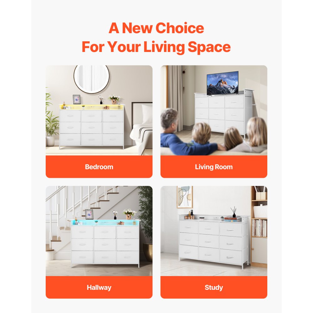 Cómoda de Tela, Cómoda Alta 1260 x 320 x 845 mm con 9 Cajones, Marco de Metal Resistente, Luces LED y Toma de Corriente Incorporada, Torre de Almacenamiento de Tela para Pasillo, Blanco - Material de oficina