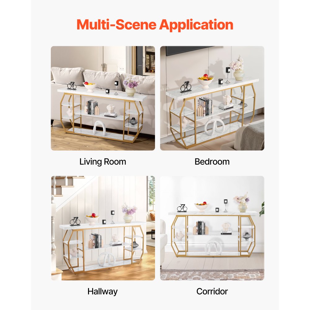 Consola de Mármol de 3 Niveles 180 x 35 x 91 cm Almacenamiento Abierto Mesa Auxiliar de Sofá con Tubos de Hierro Dispositivo Antivuelco Soporta hasta 100 kg para Salón, Entrada, Recibidor