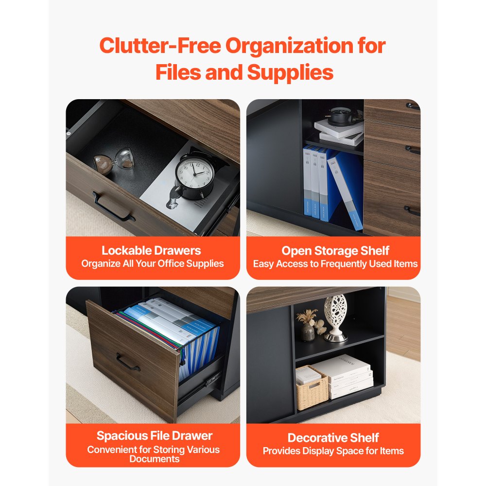 Amplio espacio de almacenamiento: Este gran escritorio en forma de L cuenta con cajones con cerradura para organizar los suministros de oficina, un cajón archivador grande para acceder fácilmente a los documentos, armarios abiertos para artículos más grandes y amplios estantes para exhibir decoraciones y mantener su espacio de trabajo ordenado y organizado