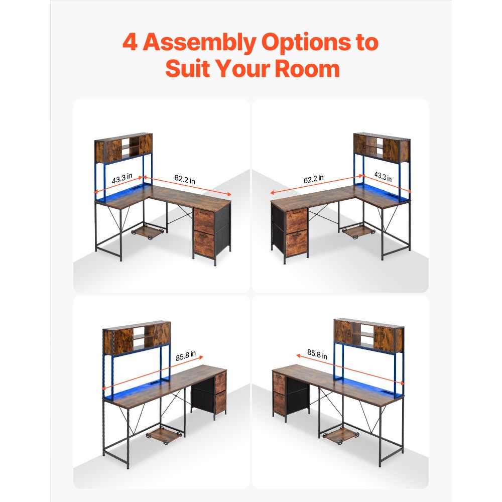 Escritorio reversible en forma de L: Aprovecha al máximo el espacio de tu rincón con nuestro escritorio esquinero. Con 4 opciones de montaje, se adapta fácilmente a diferentes distribuciones de habitación y funciona perfectamente como escritorio gaming, escritorio de ordenador o estación de trabajo para oficina en casa