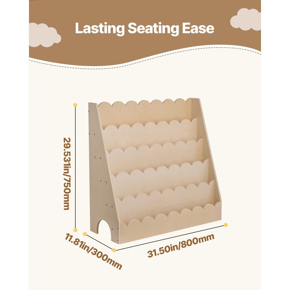 Estantería Montessori, Librería 800 x 300 x 750 mm de 5 Niveles con Borde Festoneado, Estantería Frontal con Ganchos Dobles para Guardería, Preescolar y Jardín de Infancia, Marrón Claro