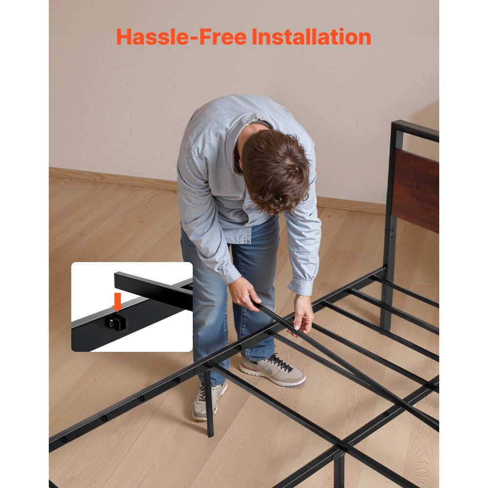 Estructura de Cama Tamaño Queen 2135x1535x990 mm de Plataforma de Metal Negra con Cabecero y Pie de Cama de Madera Marrón Retro, Espacio Debajo de la Cama, Antideslizante, no Necesita Somier - Material de oficina