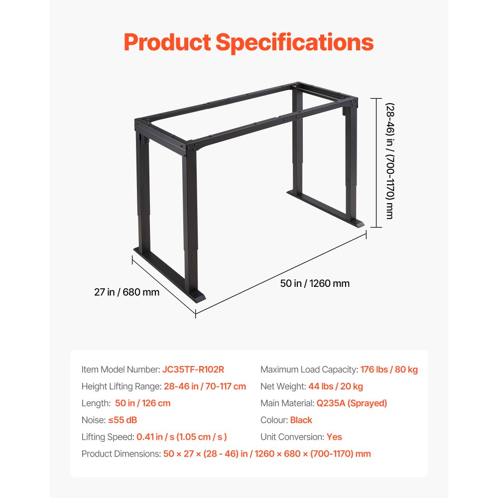 Sistema de doble motor: Supera a los escritorios de un solo motor con una velocidad de elevación de 1,05 cm/s y niveles de ruido inferiores a 55 dB para una experiencia fluida. Fabricadas con acero al carbono de alta calidad, las patas de nuestro escritorio proporcionan una base estable con una capacidad de carga de 80 kg