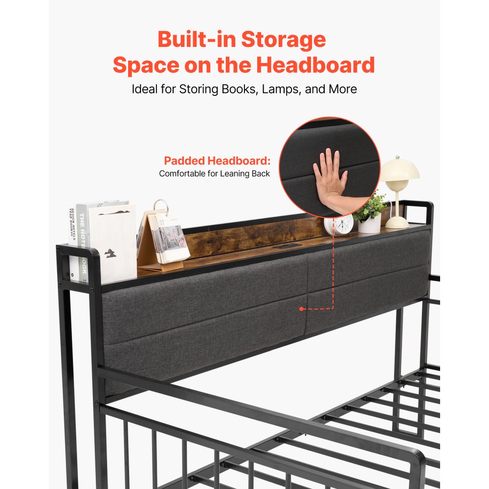 Cabecera con almacenaje: La cabecera acolchada y suave proporciona un respaldo cómodo, y el diseño de estante integrado es ideal para guardar libros, lámparas, fotos y plantas en maceta. Esta característica mantiene la habitación ordenada y cómoda, a la vez que permite acceder fácilmente a los artículos cuando los necesite