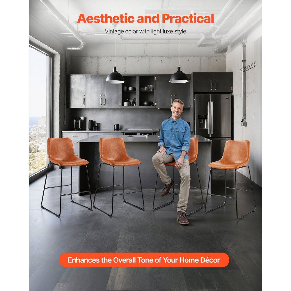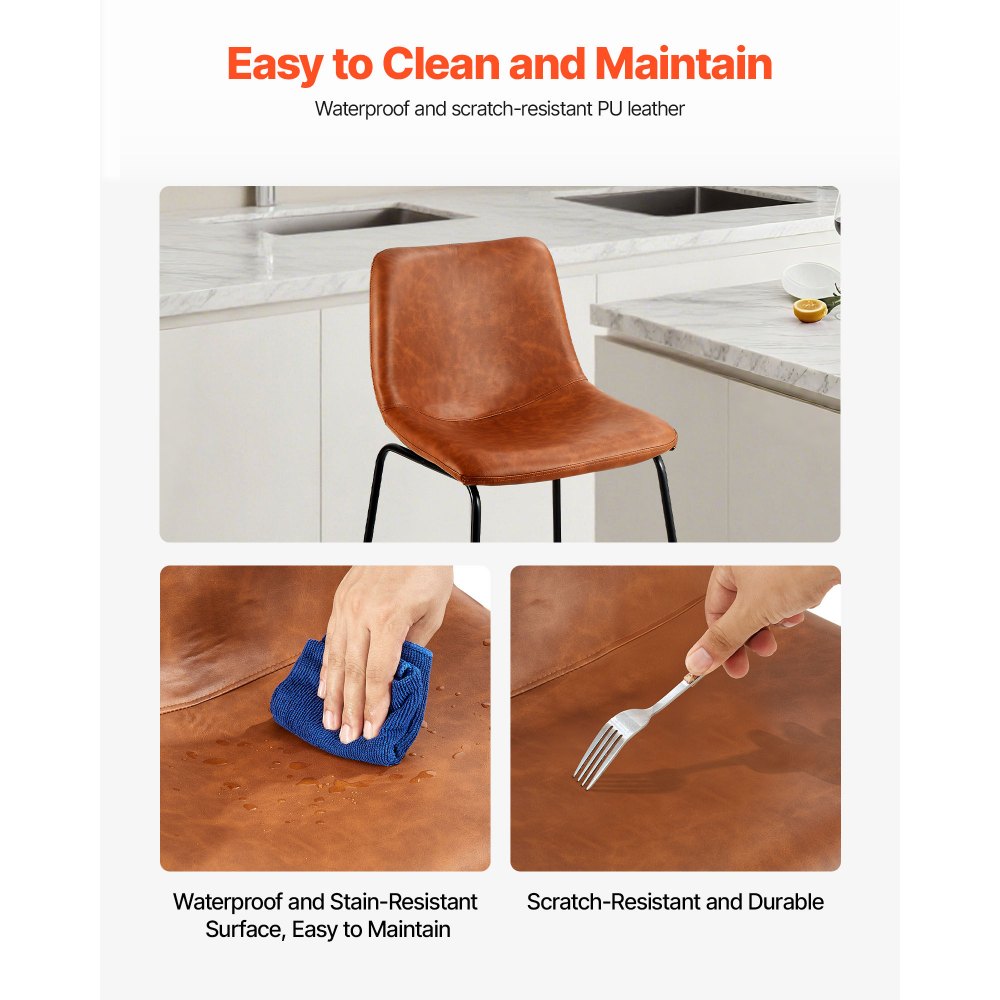 Lujo ligero y versatilidad: El cuero sintético marrón vintage, combinado con el respaldo estilizado y curvo, lo hace ideal tanto para espacios residenciales como comerciales. La altura estándar del asiento se adapta a diversas barras de bar e islas de cocina