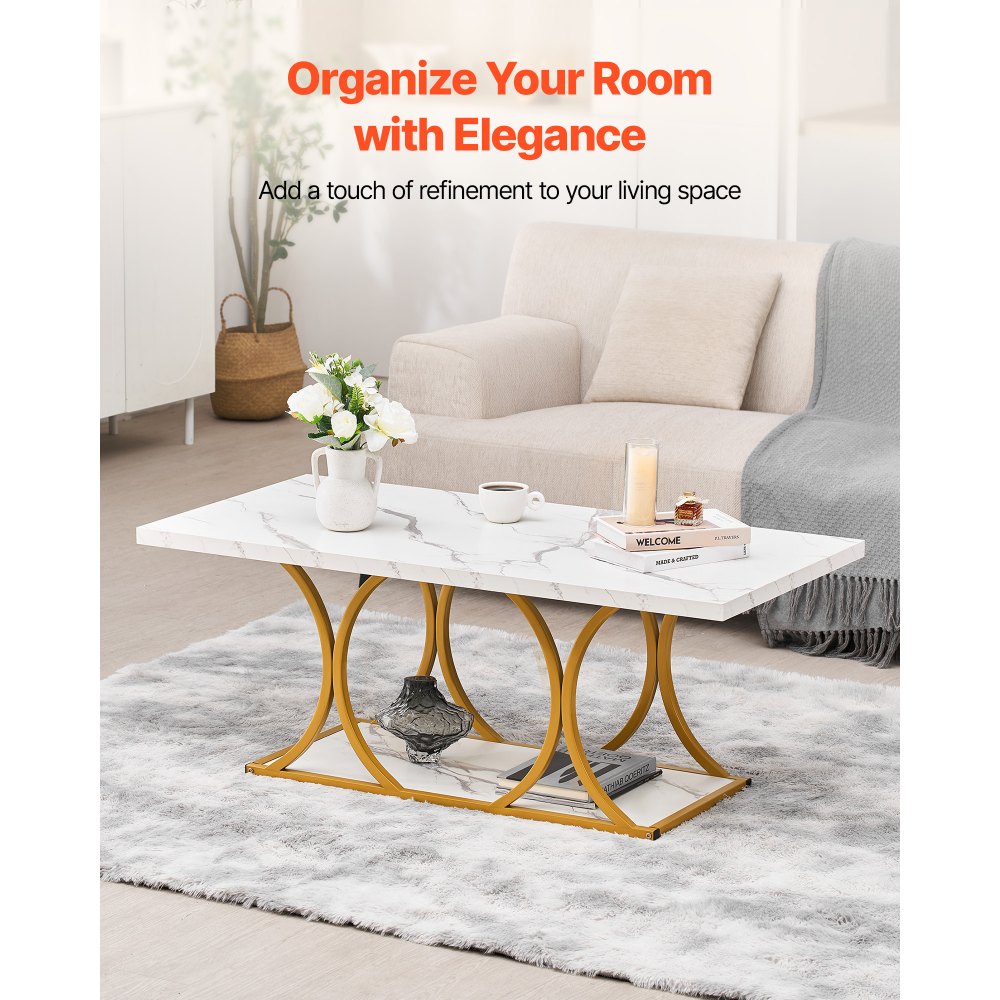 Estilo clásico-moderno: Nuestra mesa de centro rectangular cuenta con una superficie de mármol blanco y patas geométricas de metal dorado. La estructura metálica dorada le confiere un aspecto industrial-moderno único, convirtiéndola en una pieza decorativa ideal para tu hogar, perfecta para relajarte con amigos y familiares