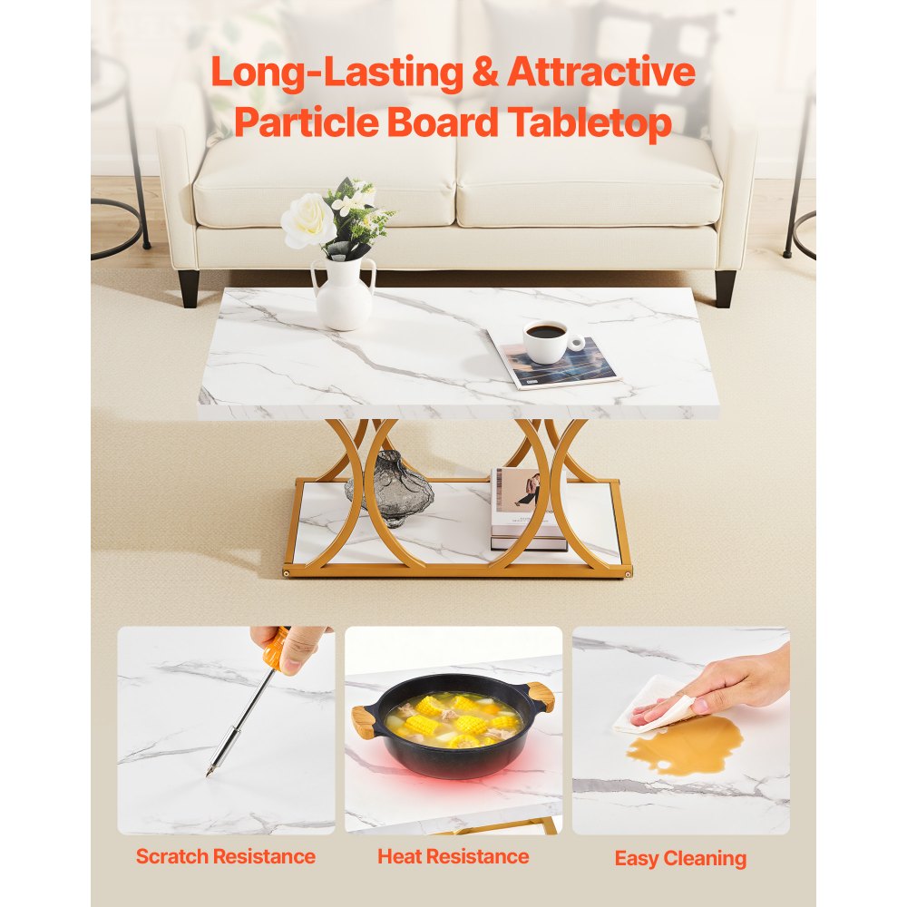 Diseño de dos niveles: La amplia superficie ofrece espacio suficiente para libros, vasos, ordenadores portátiles y aperitivos. Además, la mesa de centro cuenta con un estante en la parte inferior para objetos pequeños de uso diario, optimizando así el espacio