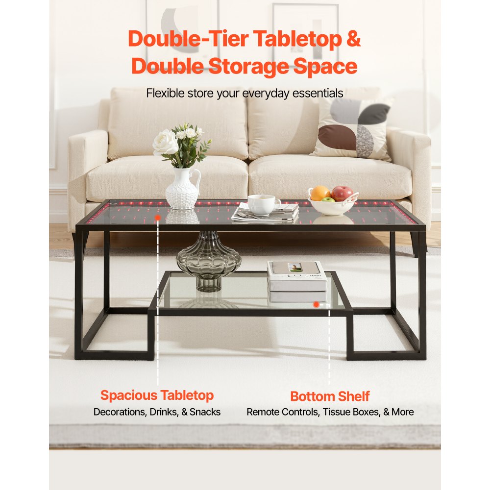 Mesa Auxiliar de Cristal Templado con Iluminación, Rectangular, con Dos Niveles y Espacio de Almacenamiento Abierto, Estilo Industrial Moderno, para Salón u Oficina, 100 x 51 x 48 cm, Negro