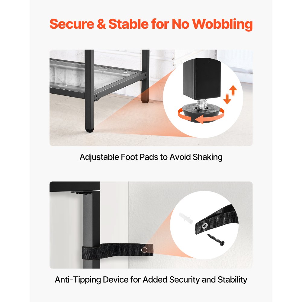 Detalles bien pensados: Las almohadillas ajustables para las patas garantizan la estabilidad de la mesa en suelos irregulares, evitando que se tambalee y protegiendo los suelos de arañazos. El dispositivo antivuelco proporciona mayor seguridad; asegúrese de instalarlo para mayor seguridad