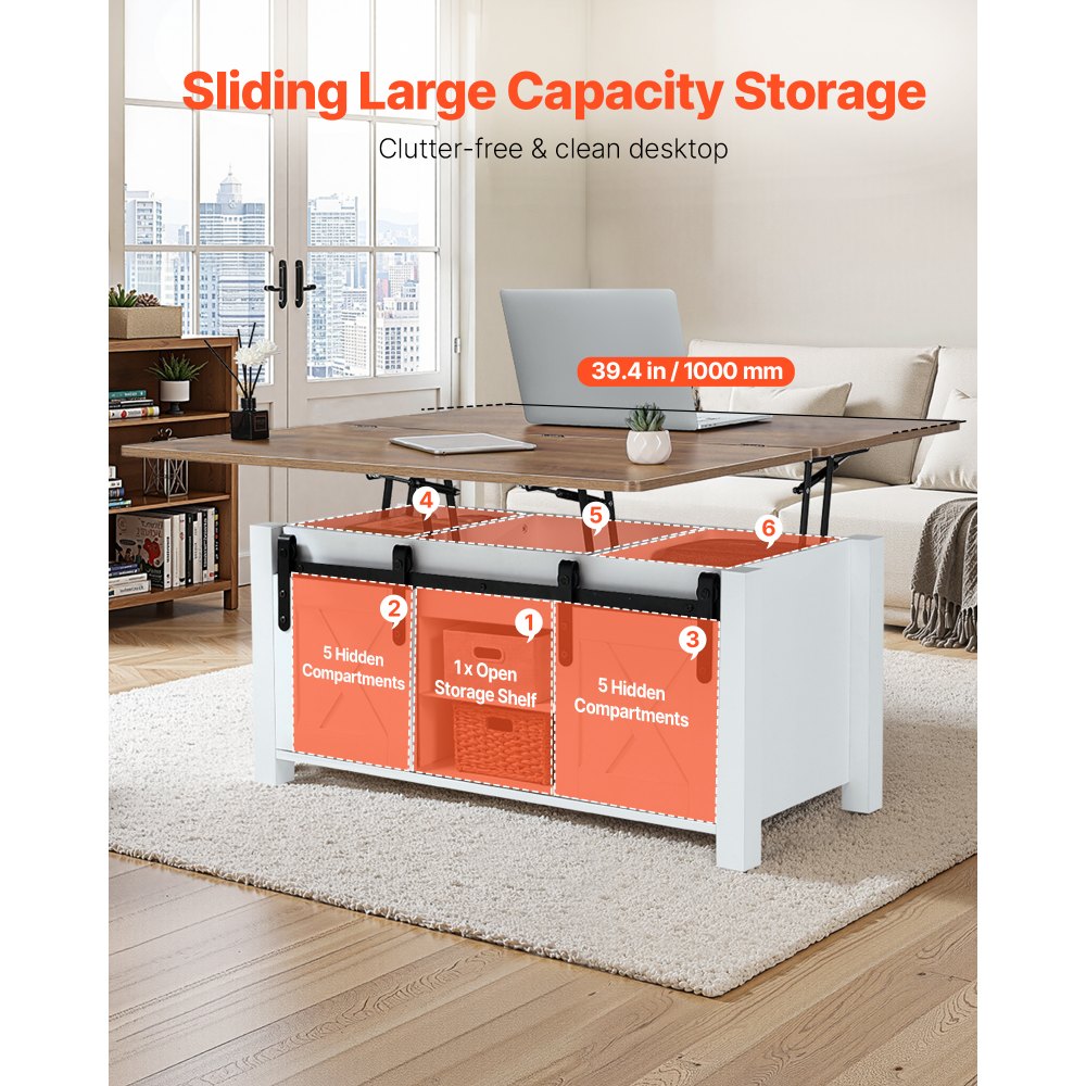 Mesa de Centro Elevable 100 cm, Mesa de Café con Puerta Estilo Granero y Compartimento de Almacenamiento Oculto, Mesita de Salón o Comedor Tablero de Color Marrón para Salón, Oficina, Hogar - Material de oficina