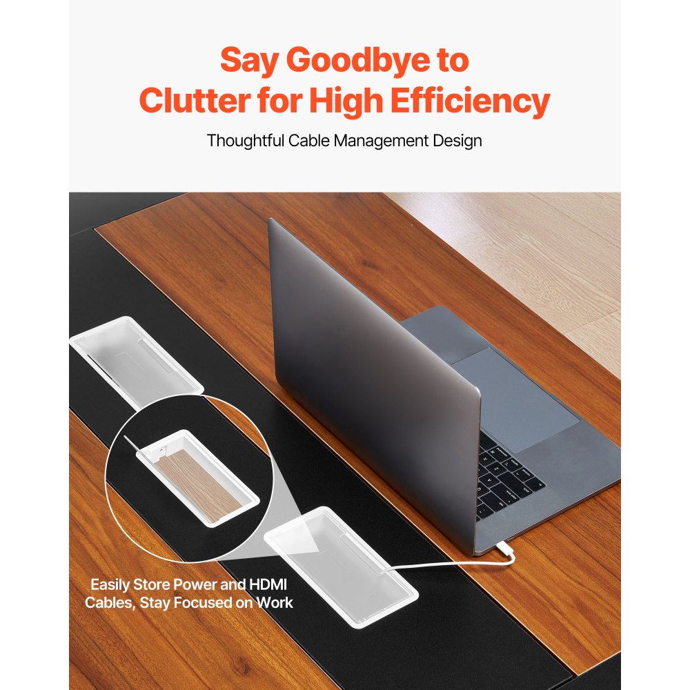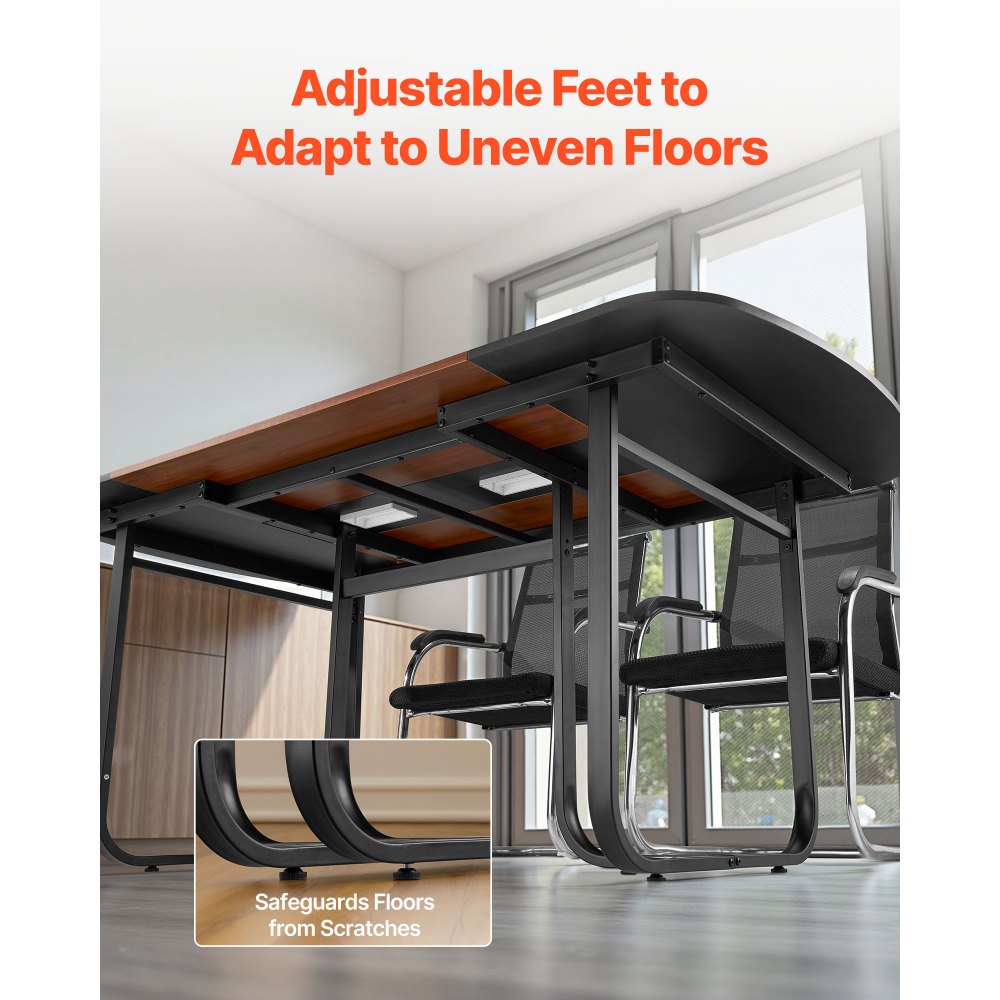 Diseño inteligente: La mesa de conferencias resistente a rayones resiste bolígrafos y reglas, e incluye un sistema de gestión de cables para guardar ordenadamente los cables de alimentación y HDMI. Las almohadillas ajustables para los pies estabilizan la mesa en suelos irregulares sin tambalearse y protegen el suelo de rayones y abolladuras