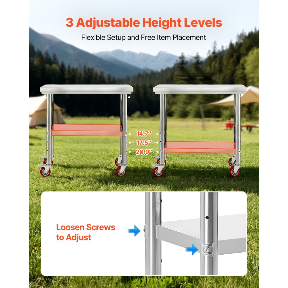Diseño de altura ajustable: El estante ajustable de tres niveles de la mesa de trabajo de preparación metálica le permite personalizar el espacio para artículos de todos los tamaños. Simplemente ajuste los tornillos para acomodar suministros altos o bajos sin esfuerzo