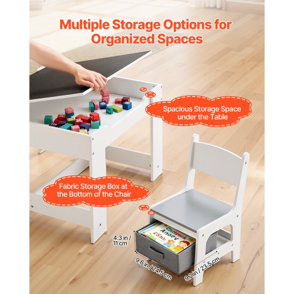 Múltiples opciones de almacenamiento: Este conjunto de mesa y sillas infantiles ofrece espacio de almacenamiento debajo de la mesa y en las sillas. Las cajas de tela no tejida, ligeras y con amplias aberturas y colores vivos, animan a los niños a explorar y les ayudan a mantener sus cosas ordenadas y organizadas