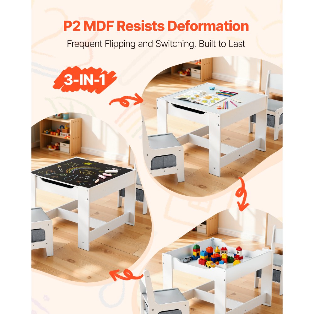 Seguro y resistente: Este conjunto de mesa y sillas infantiles está fabricado con MDF con certificación P2, lo que lo hace especialmente duradero. Tanto la mesa como las sillas soportan hasta 49,9 kg. Los bordes redondeados previenen lesiones y garantizan la seguridad de sus hijos mientras juegan y corretean
