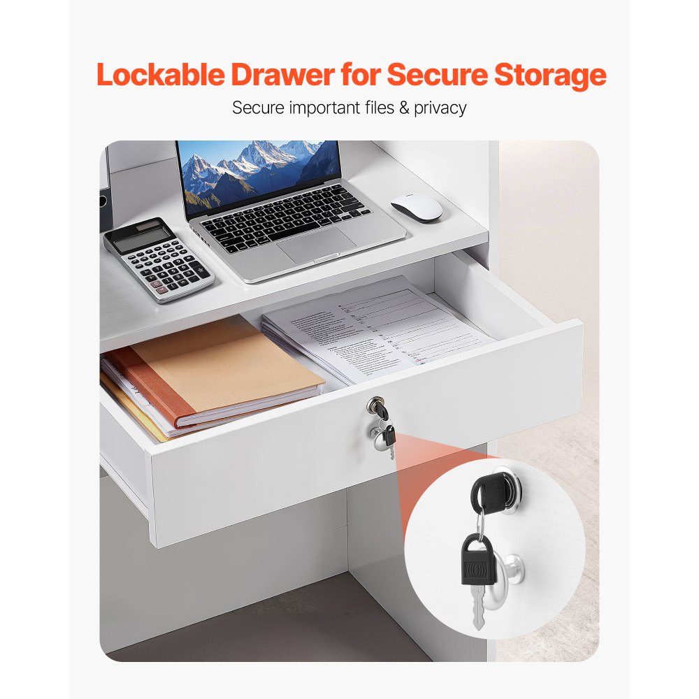 Seguridad y privacidad: Con una amplia superficie para computadoras y herramientas de uso diario, esta mesa de recepción cuenta con paneles laterales altos para mayor privacidad. El cajón con cerradura mantiene seguros los objetos de valor, y el compartimento inferior ofrece almacenamiento oculto para artículos personales
