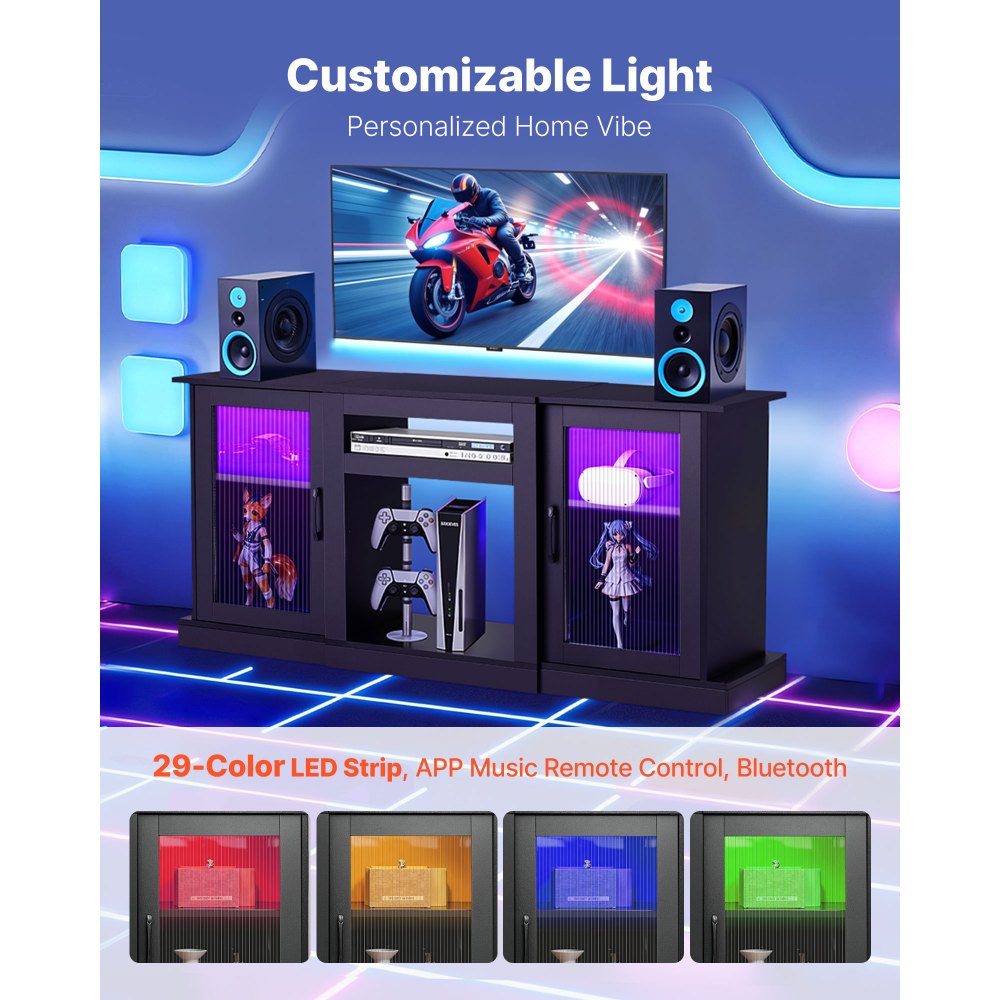Mueble de TV, Mueble de TV de Madera 1470x370x685 mm para Televisores de Hasta 1651 mm con Tira de Luz, Puertas de Vidrio y Estantes Ajustables, Consola para Sala de Estar y Dormitorio, Negro