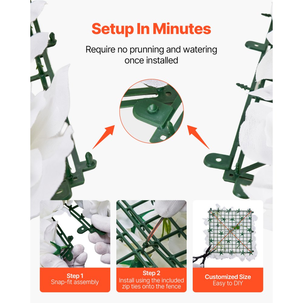 Instalación rápida y sencilla: El sistema de enclavamiento a presión le permite ensamblar su pared vegetal de manera rápida y segura. Además, incluimos 200 bridas de cortesía para ayudarlo a sujetar los paneles firmemente a cercas u otras superficies. La pared vegetal es flexible y se puede personalizar fácilmente, lo que le permite cortarla y darle forma para satisfacer sus necesidades específicas de bricolaje