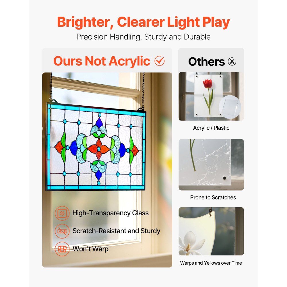 Brillo de color duradero: Elaborado con una combinación de técnicas tradicionales y tecnología moderna, nuestro panel de vidriera resiste la decoloración por la luz solar y la limpieza. Los bordes lisos del vidrio y las juntas resistentes garantizan belleza y durabilidad