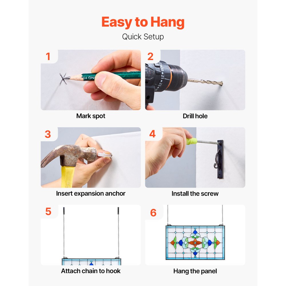 Listo para colgar: Nuestro panel de vitral incluye una cadena de hierro y ganchos preinstalados, sin necesidad de herrajes adicionales. Es fácil de colgar e instalar en cualquier superficie de pared