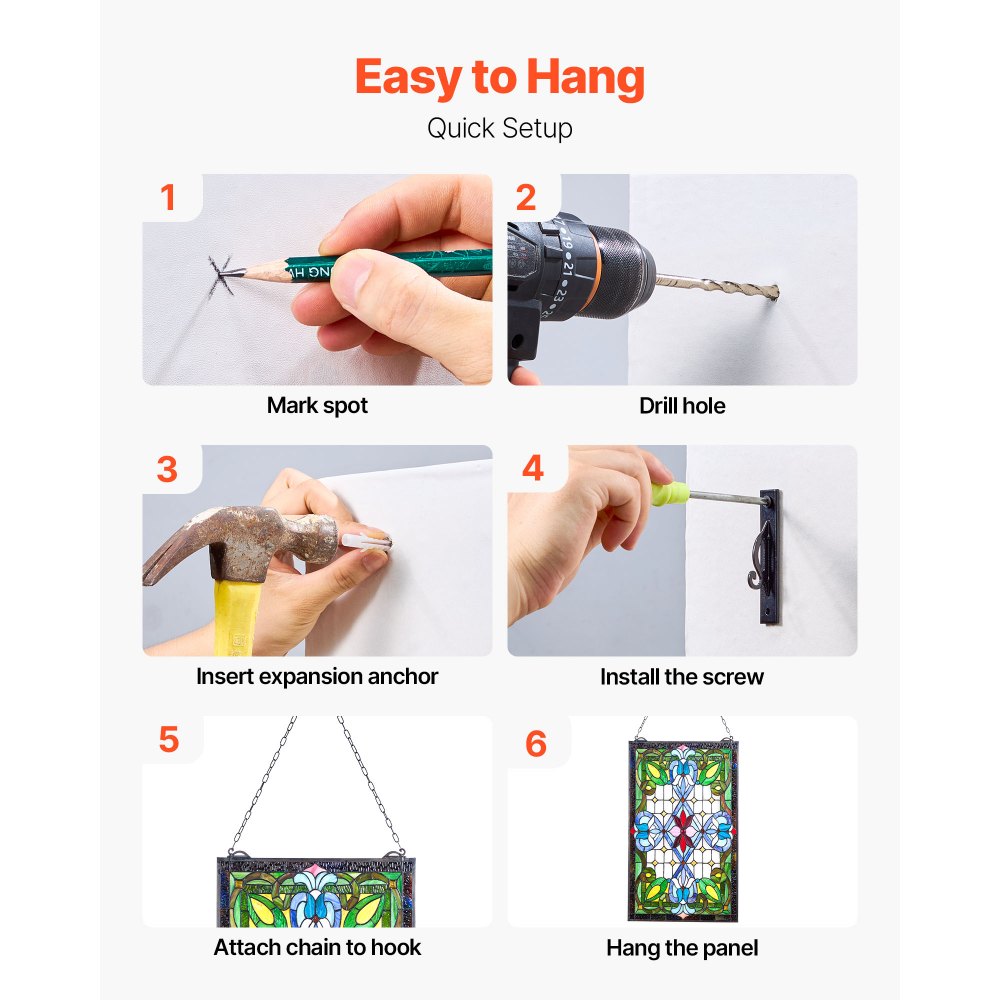 Listo para colgar: Nuestro panel de vitral incluye una cadena de hierro y ganchos preinstalados, sin necesidad de herrajes adicionales. Es fácil de colgar e instalar en cualquier superficie de pared