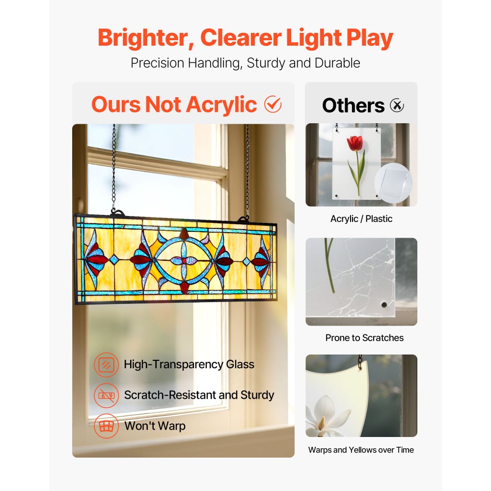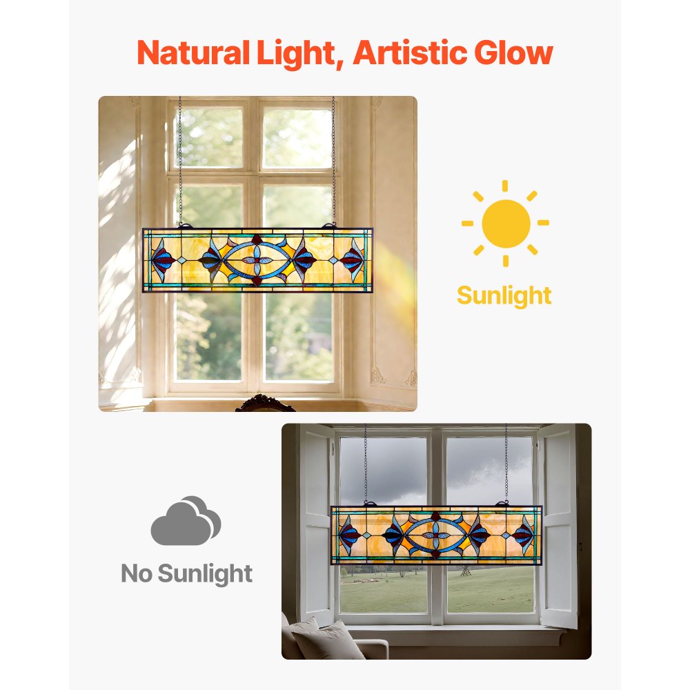 Listo para colgar: Nuestro panel de vitral incluye una cadena de hierro y ganchos preinstalados, sin necesidad de herrajes adicionales. Es fácil de colgar e instalar en cualquier superficie de pared