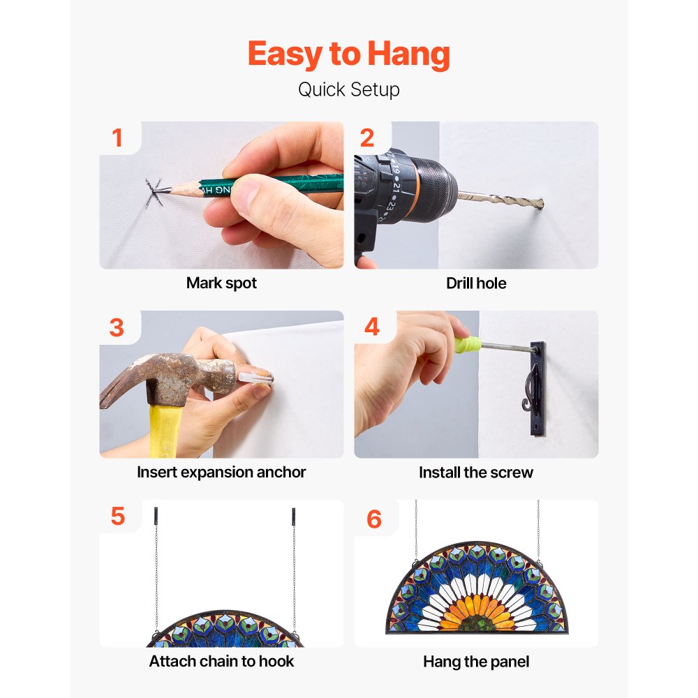 Listo para colgar: Nuestro panel de vitral incluye una cadena de hierro y ganchos preinstalados, sin necesidad de herrajes adicionales. Es fácil de colgar e instalar en cualquier superficie de pared