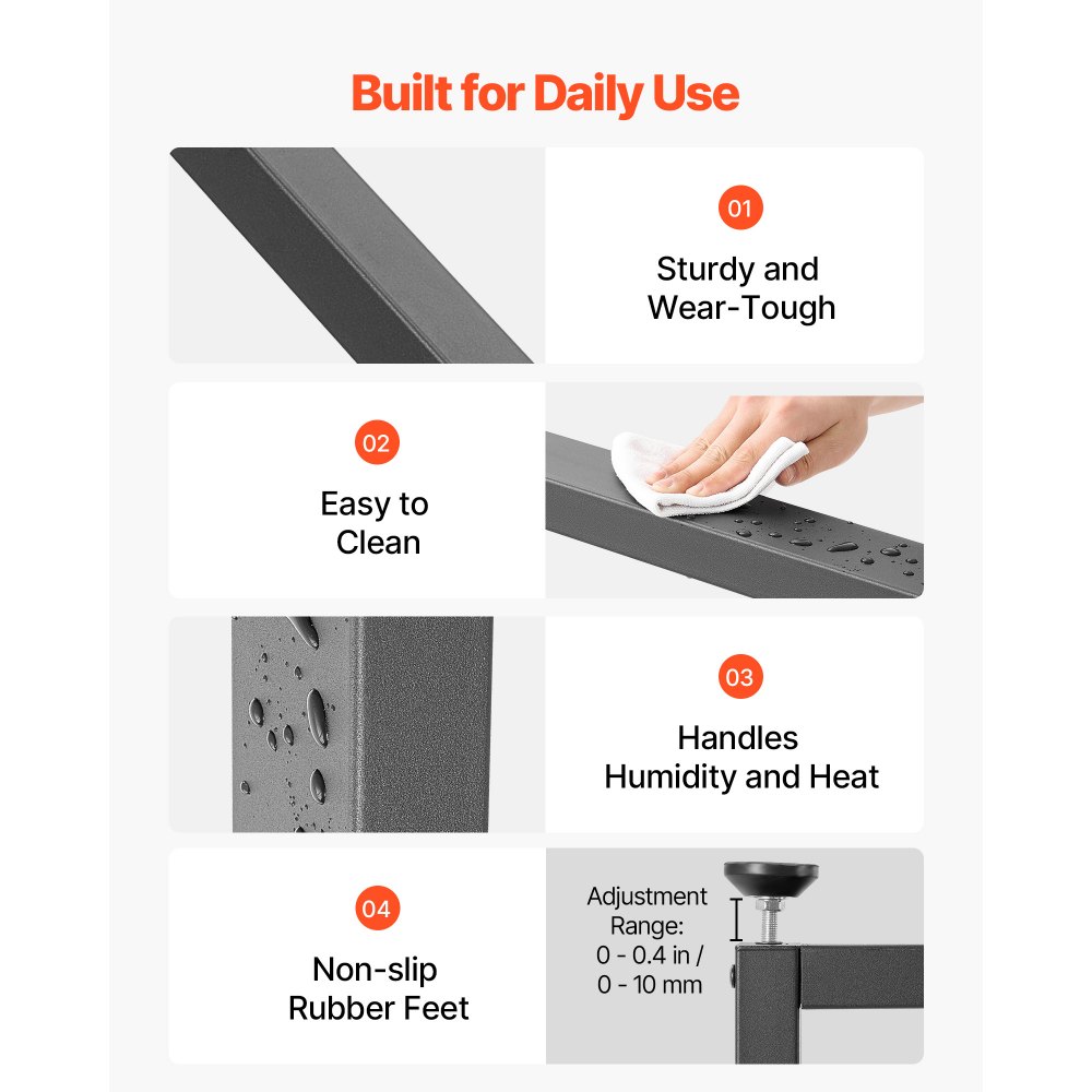 Diseñada para una mayor durabilidad: Fabricada con acero al carbono de alta resistencia, cada pata de mesa cuenta con una superficie con recubrimiento en polvo resistente a las huellas dactilares y fácil de limpiar. Cuenta con patas niveladoras ajustables de 0 a 10 mm (0 a 0,4 pulgadas) para facilitar la nivelación de la mesa